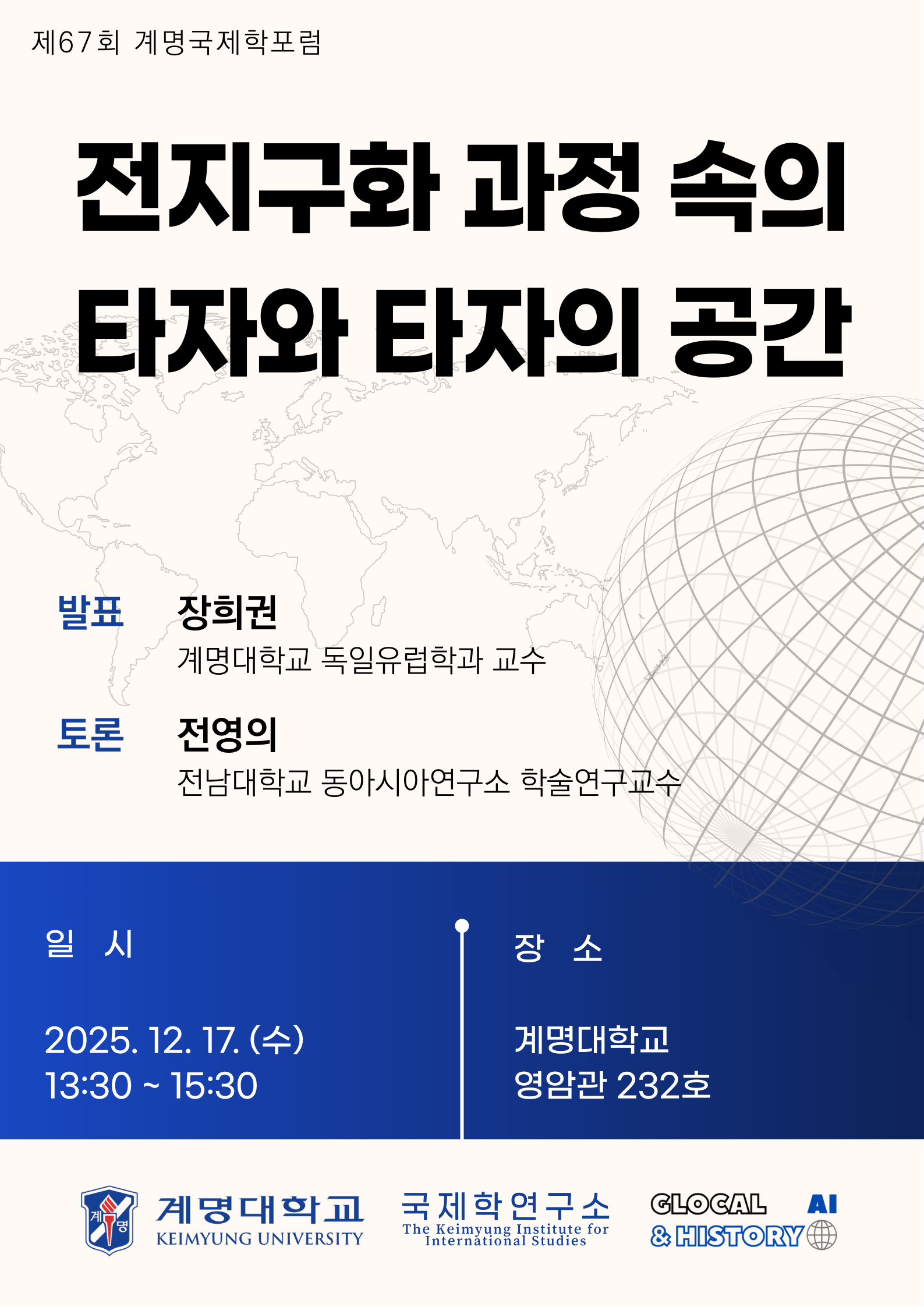 2025년 12월 17일 제67회 국제학포럼이 개최되었습니다. 계명대학교 독일유럽학과 장희권 교수님께서 “전지구화 과정 속의 타자와 타자의 공간”으로 발표해주셨습니다. 토론에는 전남대학교 동아시아연구소 학술연구교수이신 전영의 선생님께서 참여해주셨습니다.